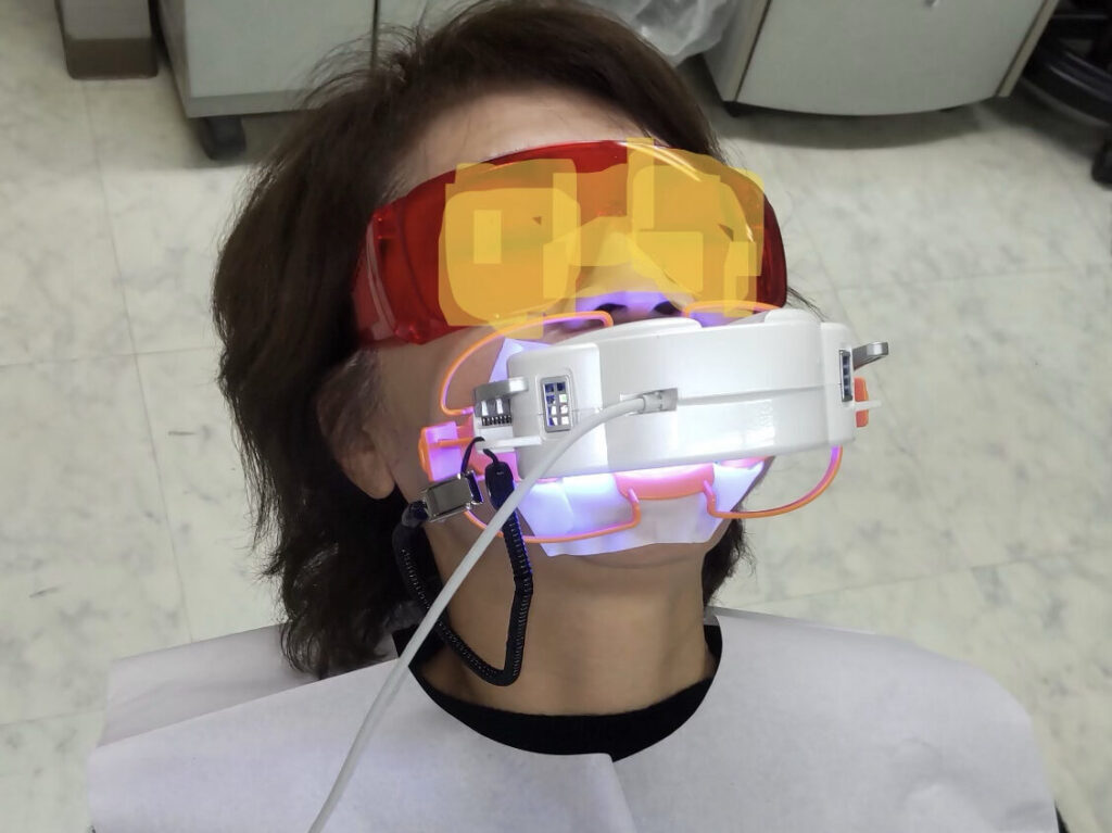 歯の表面に材料を塗布し、装置を装着してLED照明で効果を高めます。10分間の塗布を3回に分けて行います。装置は100g程度で重くありません。